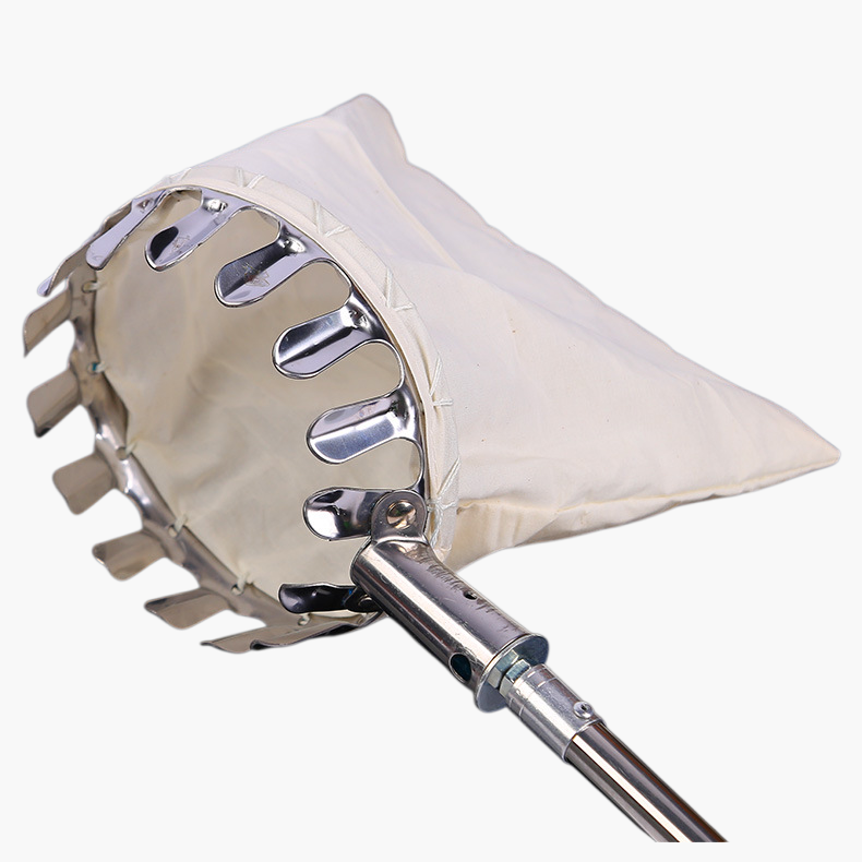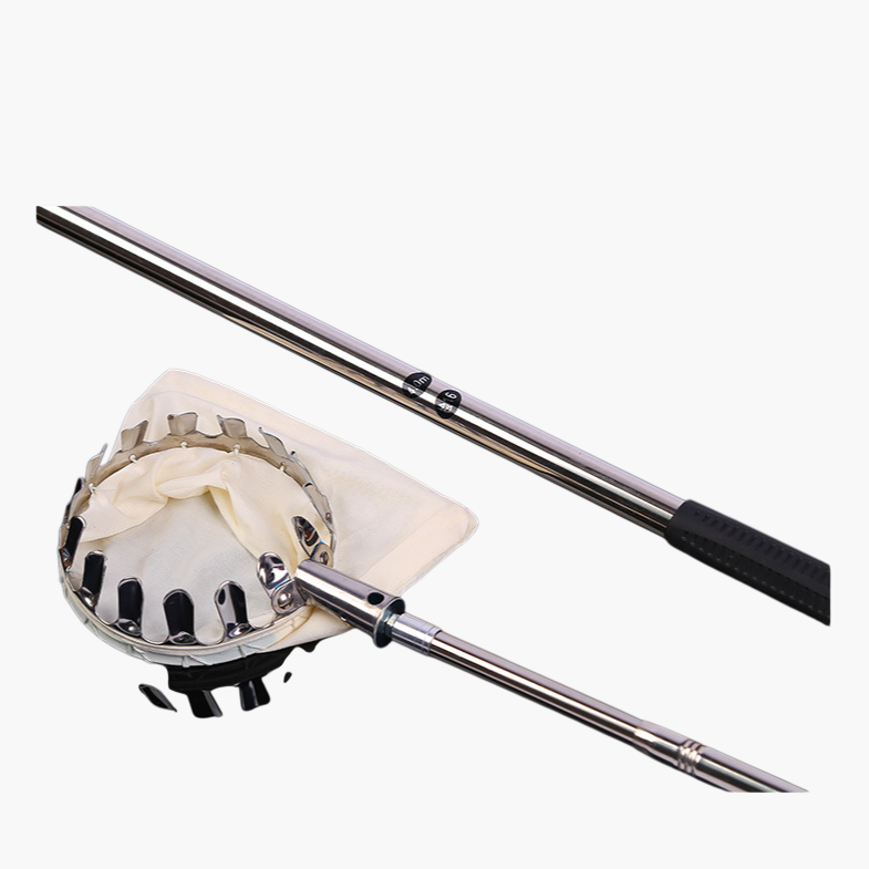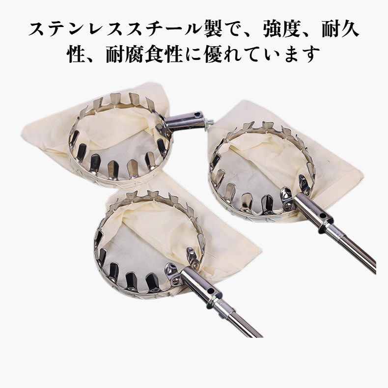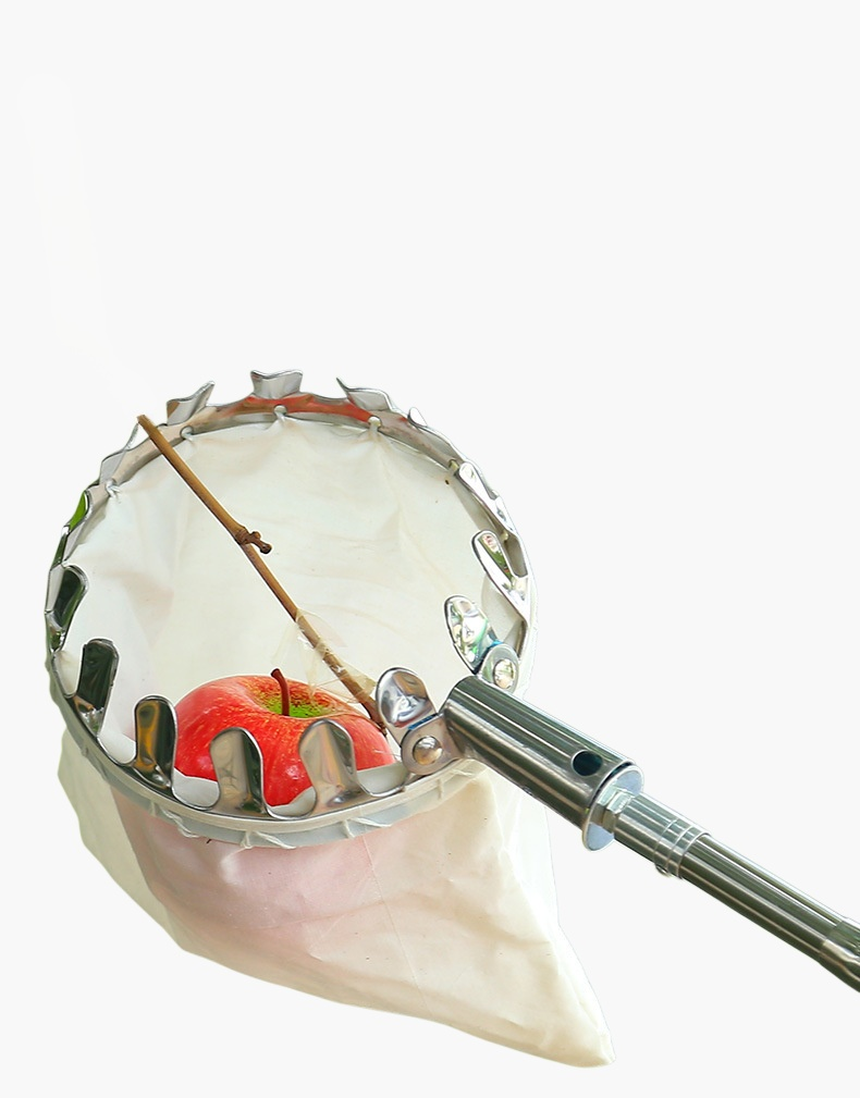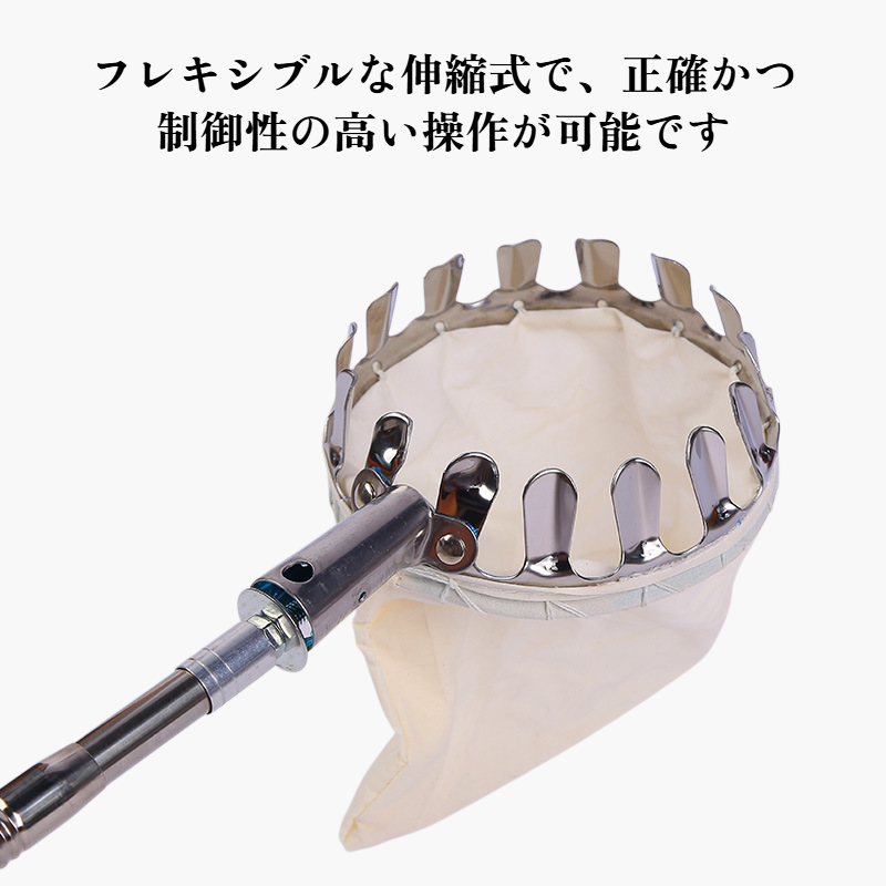 伸縮可能なステンレス摘果ポール。果樹園や高所の果実収穫に最適。耐久性が高く、長さ調整で幅広く使用可能。